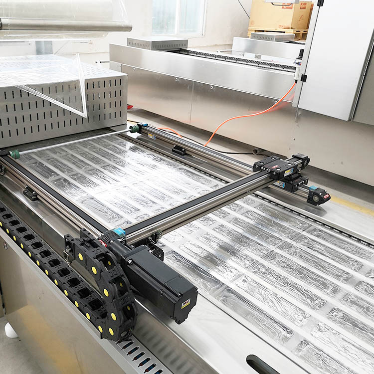 雙面拉伸膜真空包裝機(jī)工作原理是先將產(chǎn)品放在托盤里,再將托盤放入設(shè)備的放料區(qū),托盤隨著鏈條的向前運行進(jìn)入到封口模具里,模具上升,在封口模具里將上膜附在托盤上,先抽真空、(可根據(jù)用戶產(chǎn)品包裝要求,在抽真空的基礎(chǔ)上,充氮氣或混合氣體進(jìn)行包裝)封口、(上膜和托盤封在一起)沖切,后排氣,降模,包裝好的產(chǎn)品隨著鏈條繼續(xù)向前運行,從出料口出料。設(shè)備還附加了光電跟蹤對齊彩膜系統(tǒng),為用戶節(jié)約成本,提高生產(chǎn)效率,提高包裝檔次。配置廢棄邊料回收系統(tǒng),保持環(huán)境衛(wèi)生。還可以根據(jù)用戶產(chǎn)品包裝要求,配備自動打碼系統(tǒng)或者噴碼系統(tǒng)。