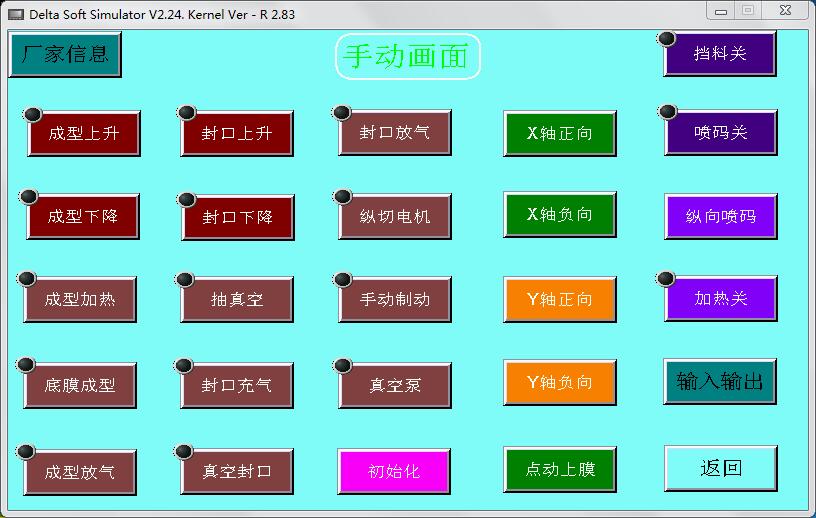 拉伸膜真空包裝機(jī)【手動(dòng)畫面】主要用于機(jī)器的手動(dòng)操作,有【廠家信息】【輸入輸出】兩個(gè)切換畫面,有【加熱開】【噴碼開】【擋料開】三個(gè)開關(guān)鍵和一個(gè)【初始化】按鍵。還有【成型上升】【成型下降】等二十個(gè)點(diǎn)動(dòng)觸摸鍵。如下圖: